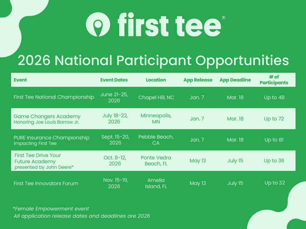 First Tee Drive Your Future Academy presented by John Deere is a female empowerment event recognizing young women who are motivated to influence positive impact at their chapters, schools and communities. The five-day academy experience focuses on the importance of building a strong network and how to approach mentorship opportunities, navigating post-graduation and career planning, and appreciating the value/impact of volunteerism.